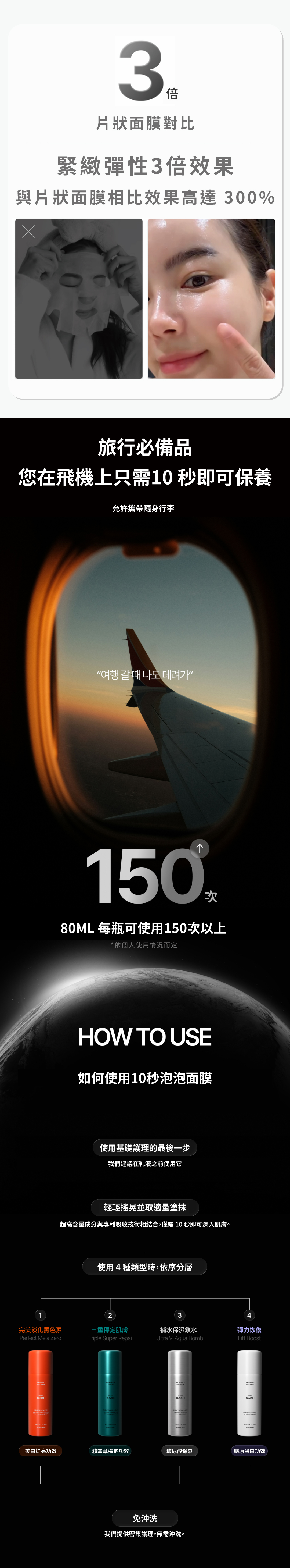 「每天快速補水,感受水潤光澤」、「3秒完成,如多重面膜般的滋潤感」