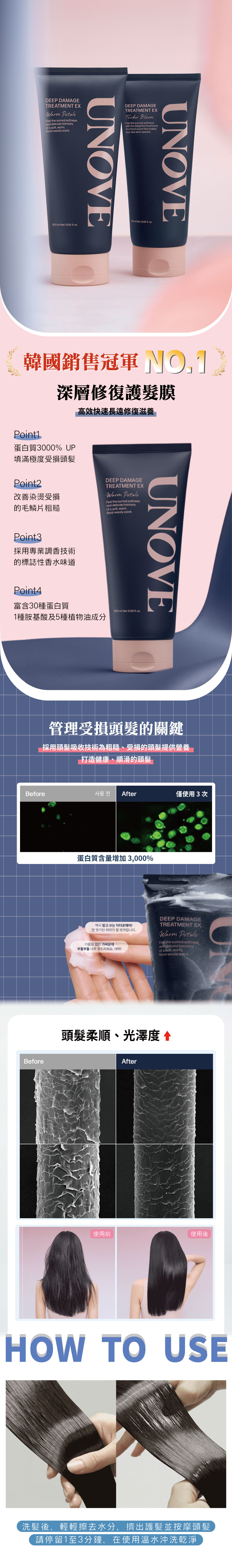 使用方式:洗髮後擦乾多餘水分,取適量均勻塗抹於受損髮絲並輕柔按摩,最後以溫水沖淨。